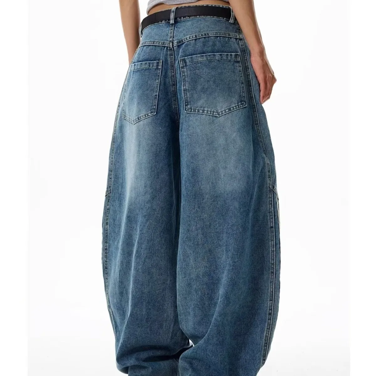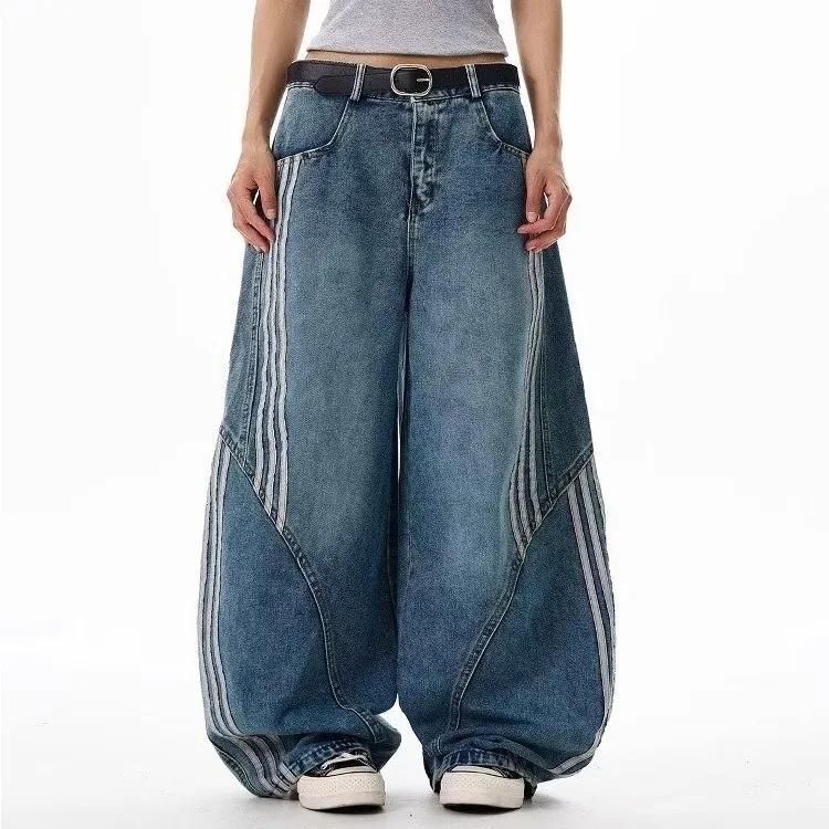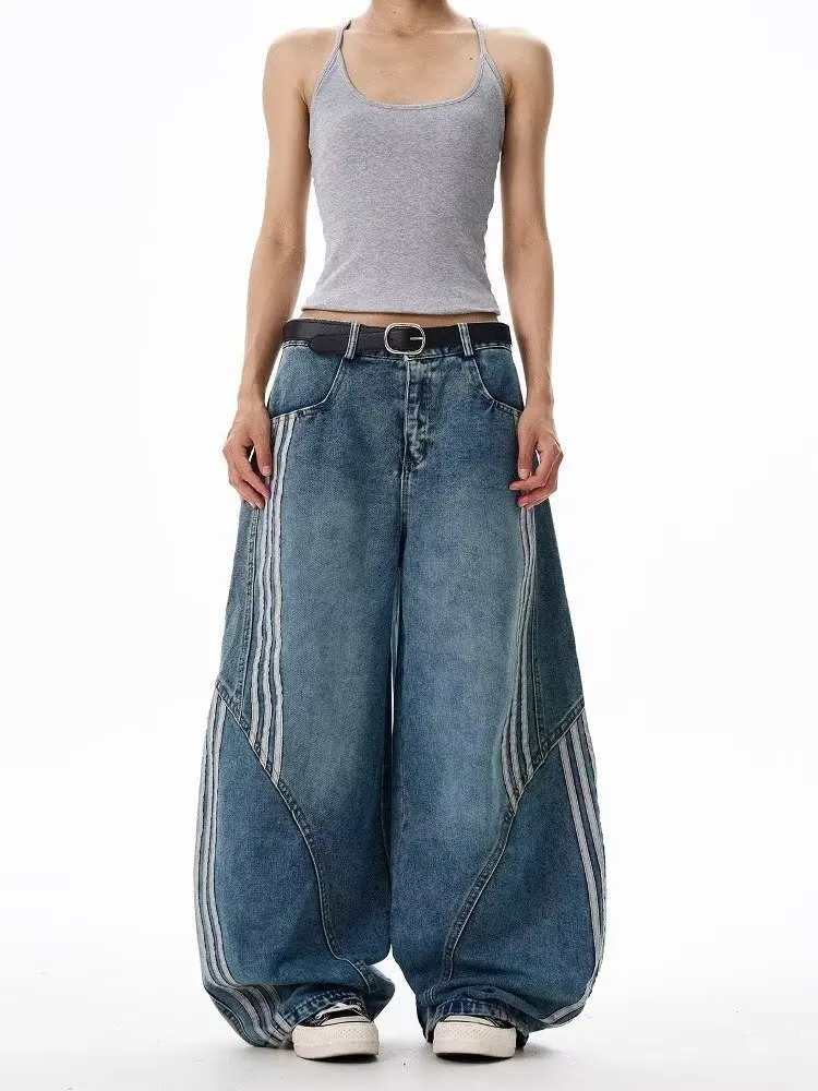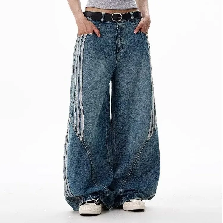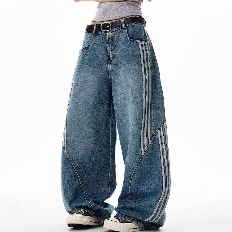 2026 New Distressed Mid-waist Wide-Leg Jeans Women's Side Striped Loose Straight-leg Floor-Mopping Pants